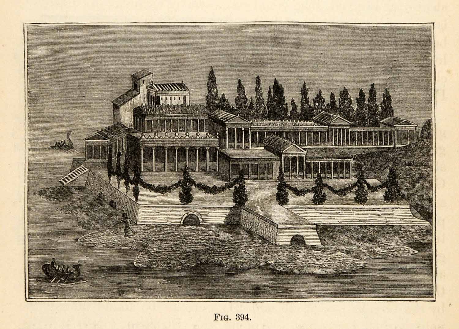 This is an original 1876 black and white in-text wood engraving of "View of a Roman Villa" originally from a wall painting (fresco).