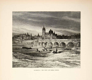1876 Wood Engraving Salamanca Castile Leon Spain Dore Roman Bridge Church XGJC4
