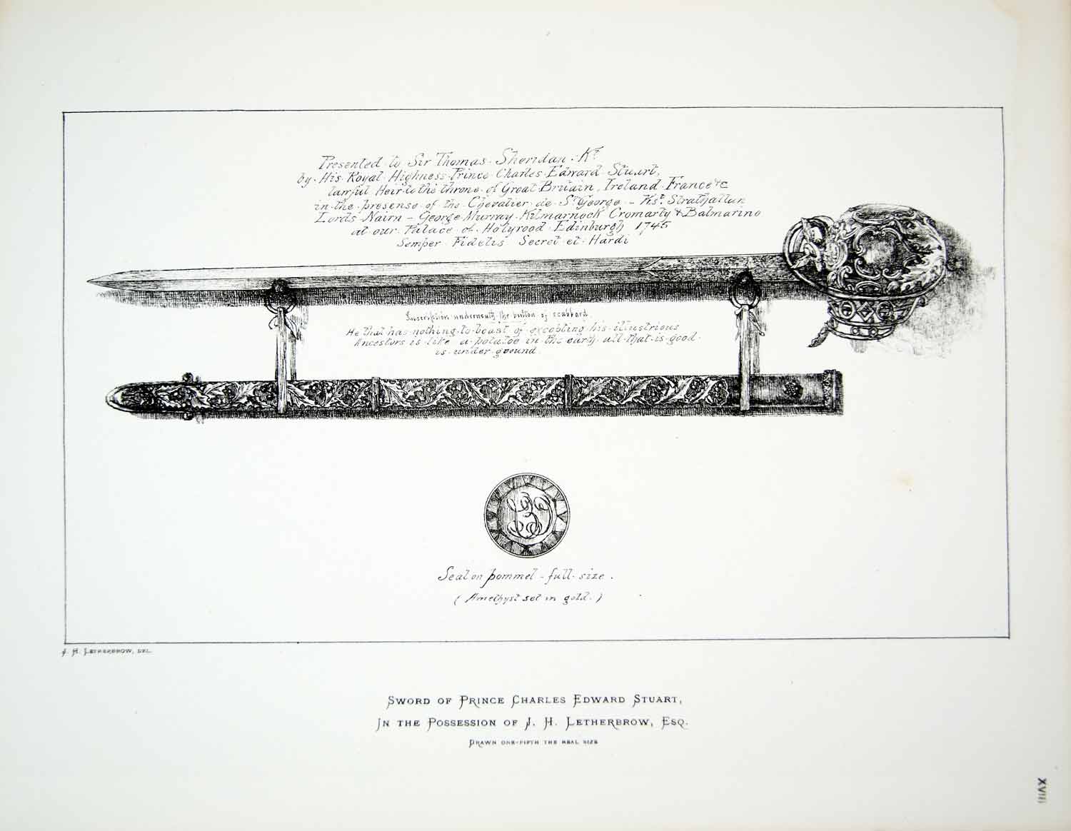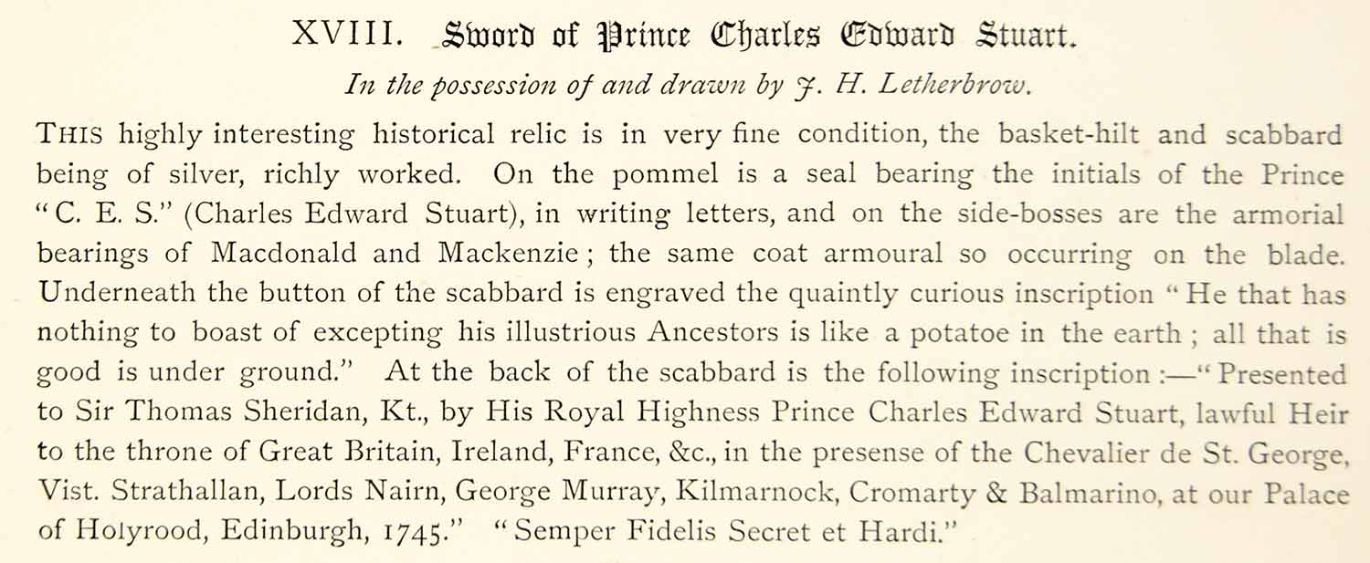 This is an original 1877 black and white lithograph of a drawing by John Henry Letherbrow of the 18th century sword of Charles Edward Stuart, (also known as "The Young Pretender" and "Bonnie Prince Charlie"), who is perhaps best known for inciting the Jacobite uprising of 1745 and leading the insurrection. This silver basket-hilt sword and scabbard were presented to Prince Charles by Sir Thomas Sheridan at the Palace of Holyrood in Edinburgh, Scotland in 1745 CE. The inscription beneath the button of the scabbard reads; "Semper Fidelis Secret et Hardi".