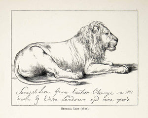 This is an original 1877 black and white relief line-block print of a pencil drawing titled, "Senegal Lion, 1811."