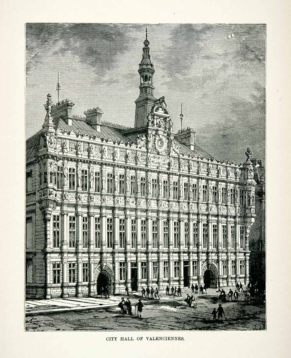 This is an original 1877 black and white wood engraving of the City Hall of Valenciennes, France. Aside from its use as a central administrative center, the City Hall was besieged by the First Coalition against Revolutionary France in 1793. It was later retaken by the revolutionaries in August of 1794. On a side note, some citizens of the town tortured, raped, and guillotined (in that order?), five Ursine nuns during the Reign of Terror. Scary stuff indeed.