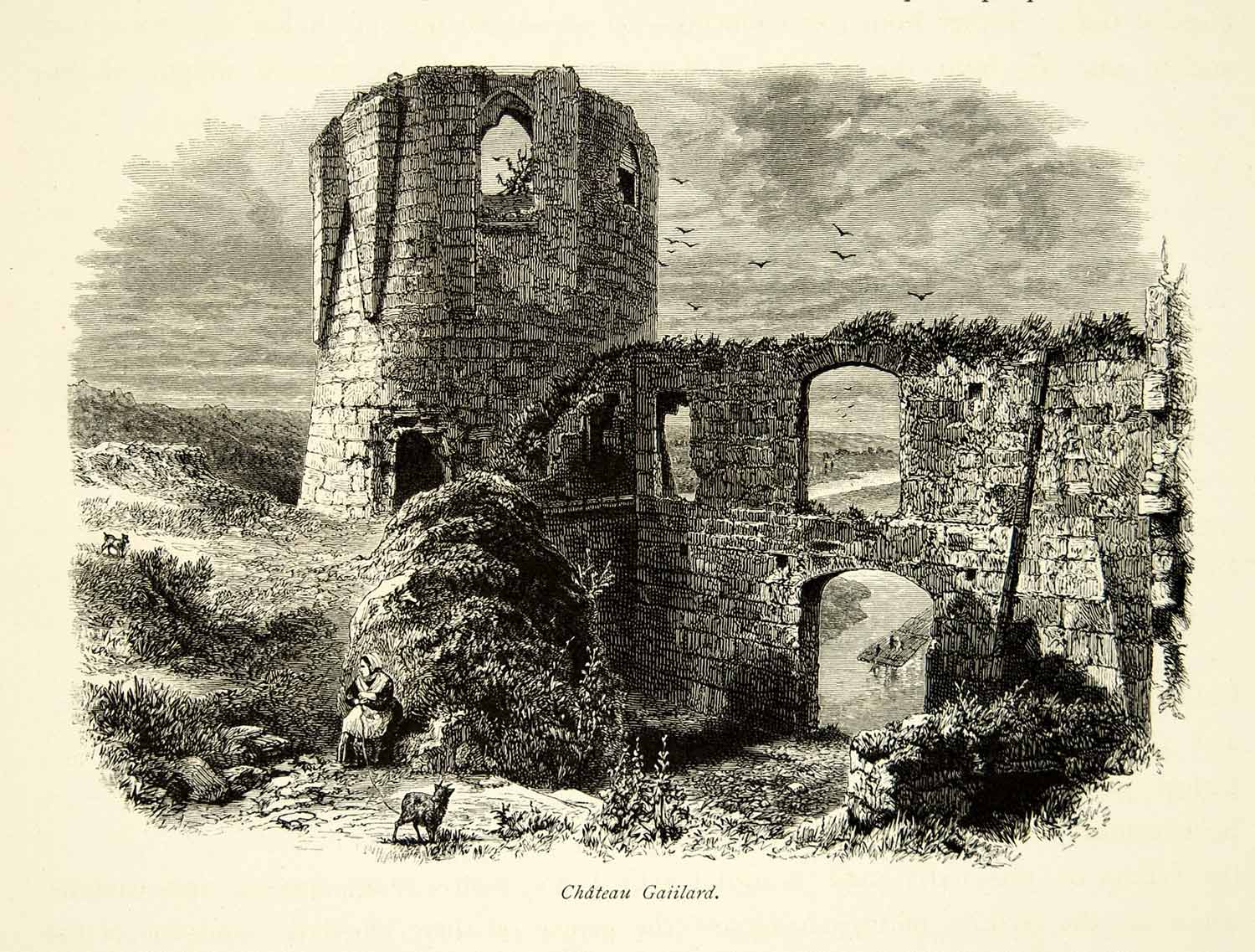 1877 Wood Engraving Chateau Gaillard Les Andelys France River Seine Europe YPE2