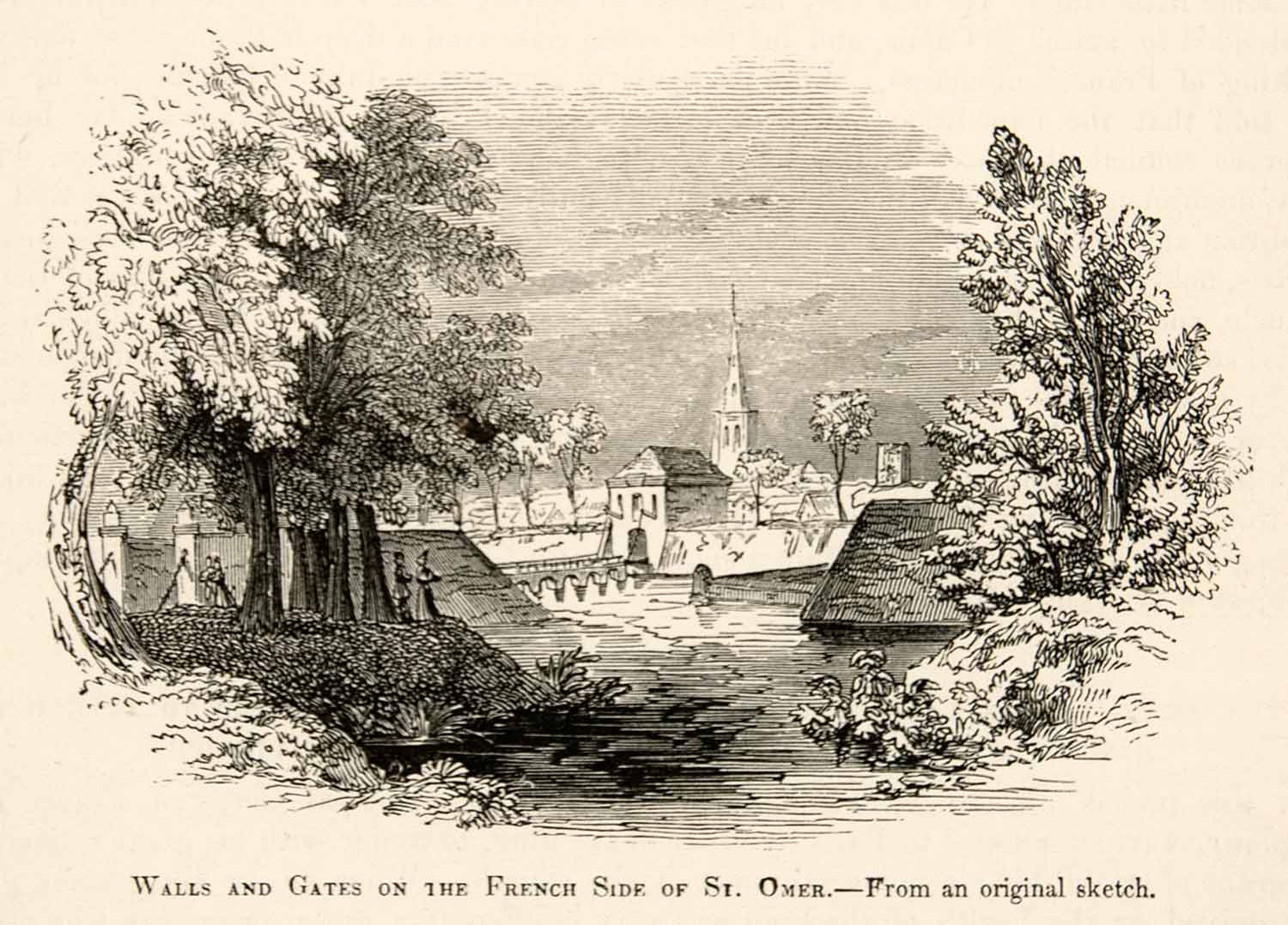1877 Woodcut Walls Gates St. Omer French Side Original Sketch France XEF4