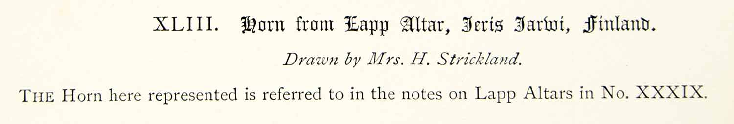 This is an original 1878 black and white lithograph of a drawing by H. Strickland of a reindeer horn from part of a traditional religious altar of the Sami people, (also known as Lapps or Laplanders), from the area near Jerisjärvi, Finland.