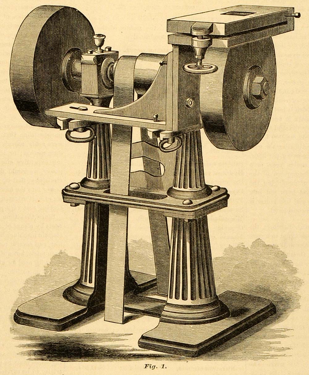This is an original 1878 halftone print of a Grinder No. 5 machine, especially adapted for railroad and machine shops, made by American Twist-Drill Company, and available from Mr. E. A. Goddard, 176 Fulton Street, New York.