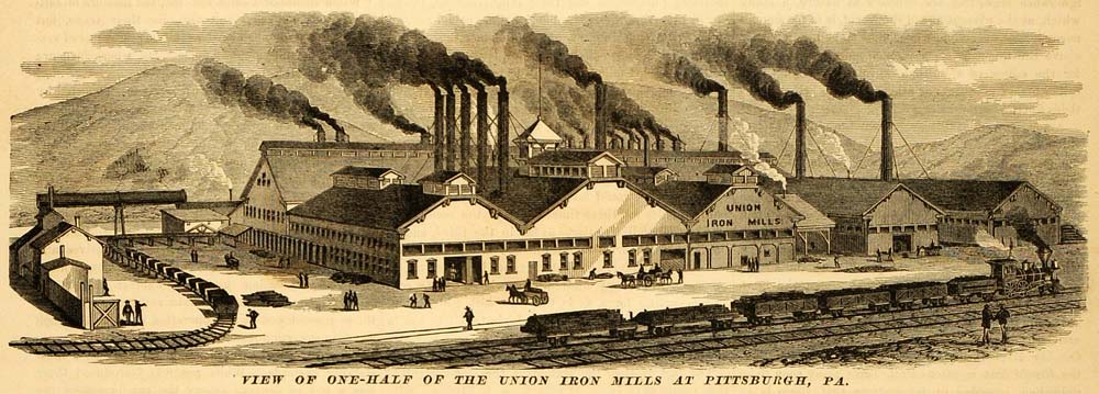 This is an excellent original 1878 halftone print of the Union Iron Mills in Pittsburgh, Pennsylvania; owned by Carnegie Brothers & Company. The Union Iron Mills was one of the largest rolling-mills in the United States, situated between the Alleghany River and the Alleghany Valley Railroad in the 15th Ward.