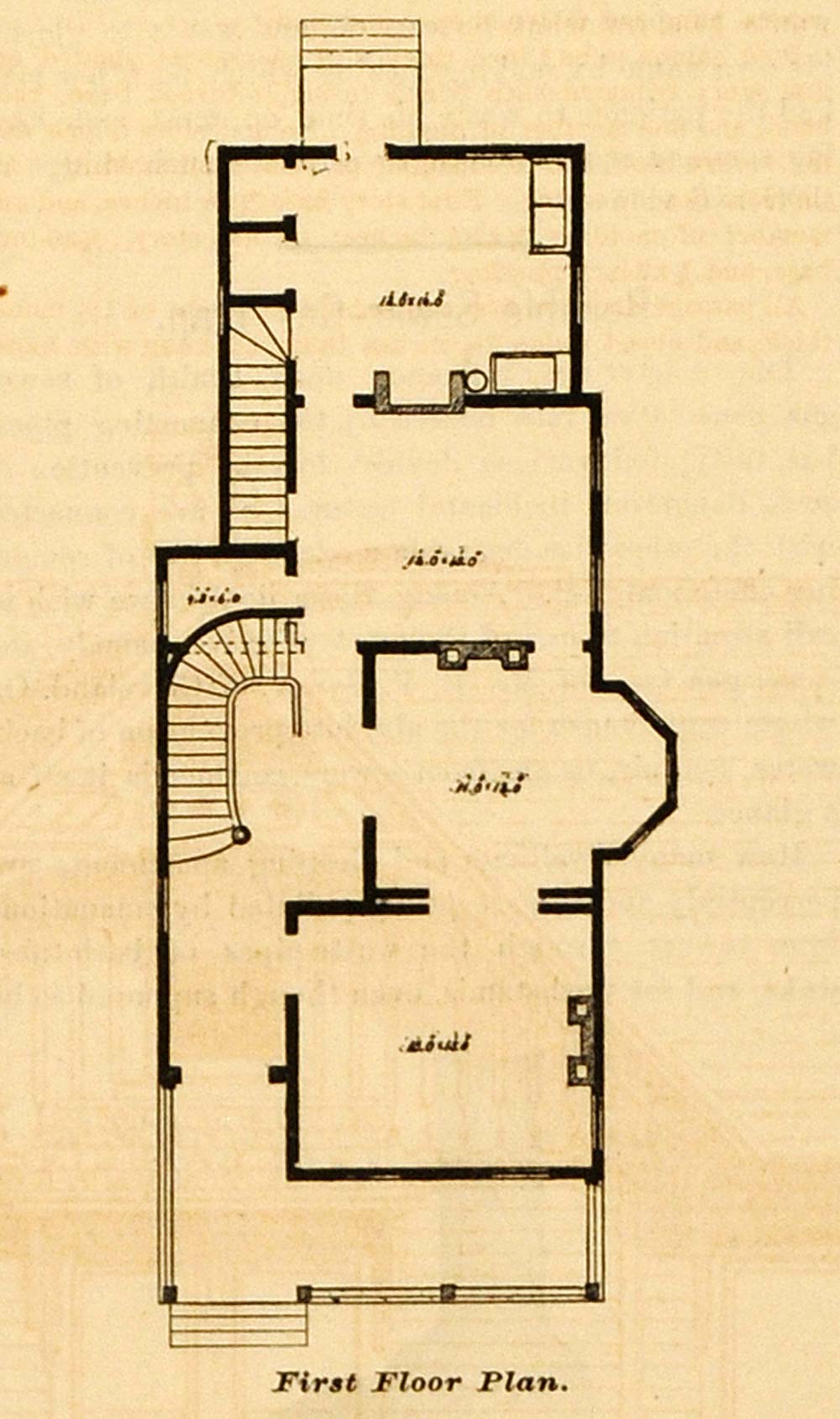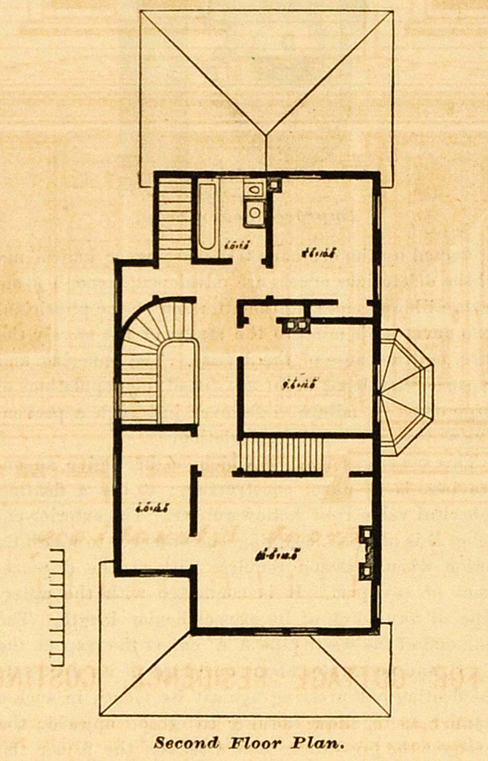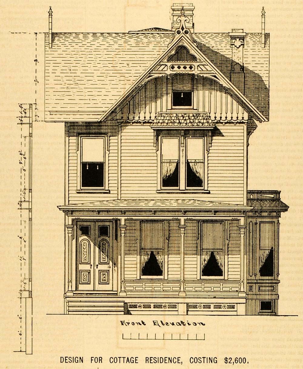 This is a set of three original 1878 halftone prints of an architectural sketch of a cottage residence design, costing $2,600, from drawings made by Mr. D. B. Provoost, architect of Elizabeth, New Jersey. The first image is an illustration of the front elevation. The second image is the first floor plan. The third image shows the second floor plan.