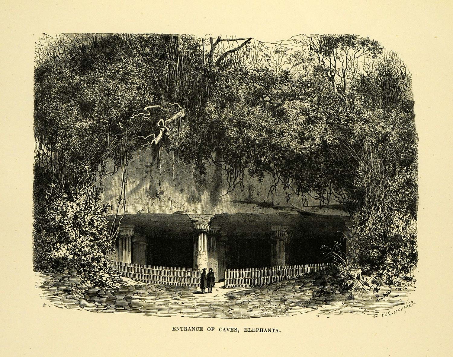 This is an original 1878 black and white wood engraving of the entrance of the Elephanta Caves, located on Elephanta Island, Maharashtra, India. The area offers five Hindu caves, and two smaller Buddhist caves, all dating from between the late 5th century to the late 8th century AD. The caves were renovated in the 1970s after several years of neglec, and in 1987, were designated a UNESCO World Heritage Site.