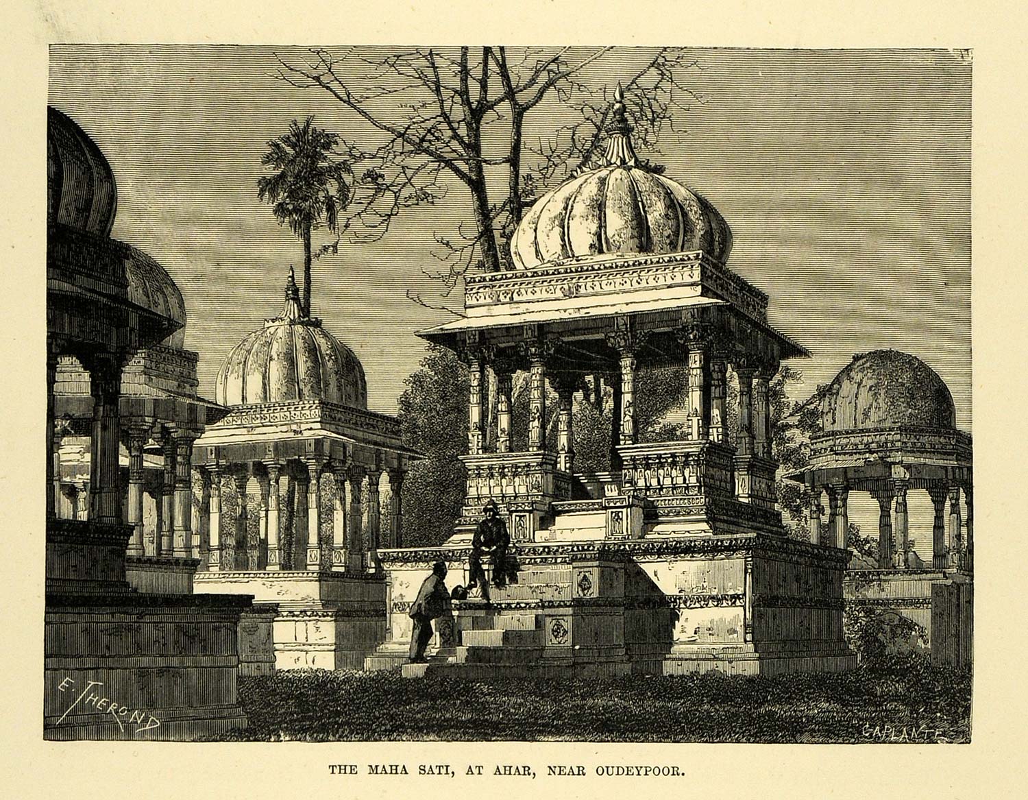 This is an original 1878 black and white wood engraving of Shri Mahasatyaji in Ahar, near Udaipur, Rajasthan, India. This image shows the entrance to the cemetery of the Mewar royal family.