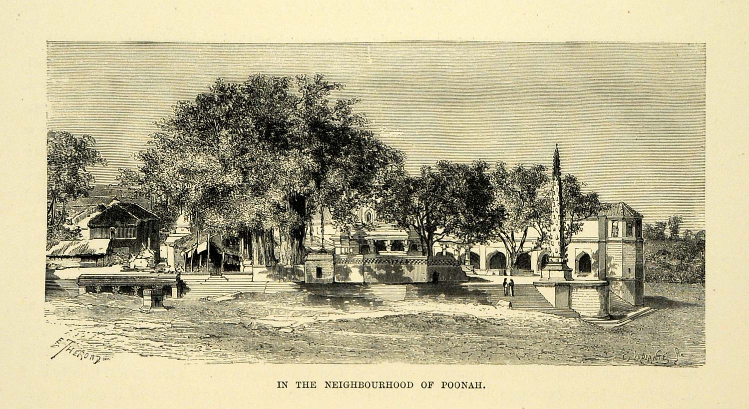 This is an original 1878 black and white wood engraving of the neighborhood of Poonah, India.