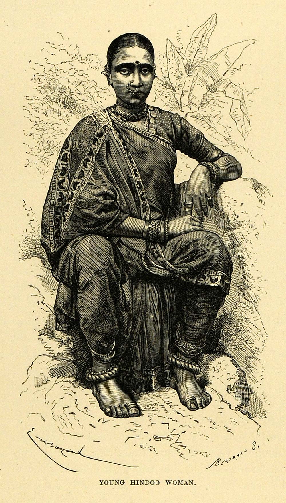 This is an original 1878 black and white wood engraving of a portrait of a young Hindu woman of India.