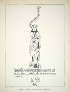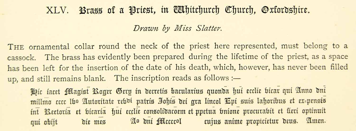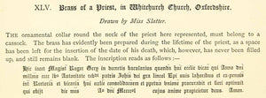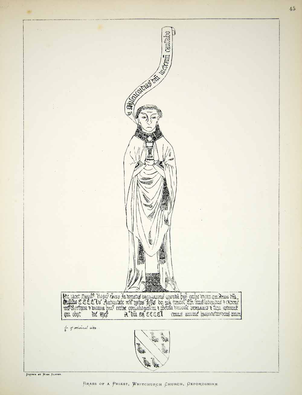 This is an original 1880 black and white lithograph of a drawing by E.A. Slatter of the brass of a priest from inside the parish church at Whitchurch in Oxfordshire, England, United Kingdom.