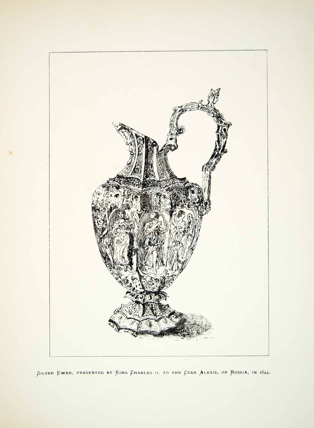 This is an original 1880 black and white lithograph of a drawing by Marie C. de Bogouschefsky of a 17th century silver ewer, (a type of vase-shaped pitcher), that was presented by King Charles II of England to Czar Alexis of Russia, (the father of Peter the Great), in 1664 CE.