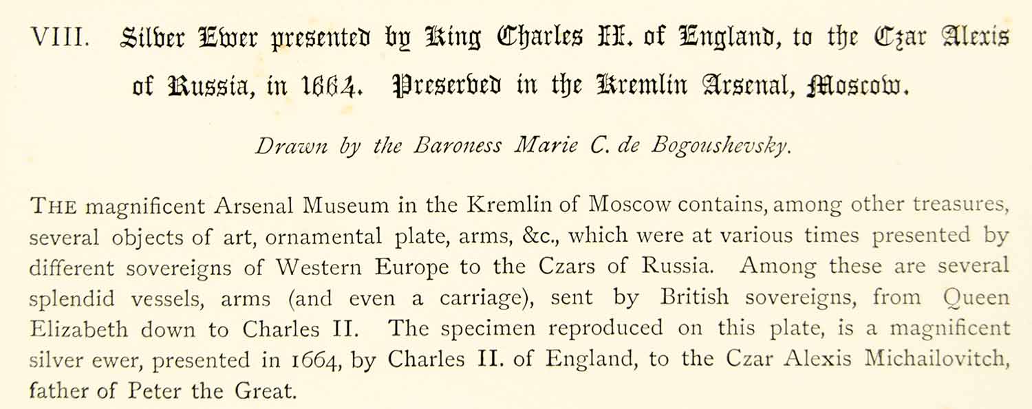 "Silver Ewer presented by King Charles II of England, to the Czar Alexis of Russia, in 1664. Preserved in the Kremlin Arsenal, Moscow."