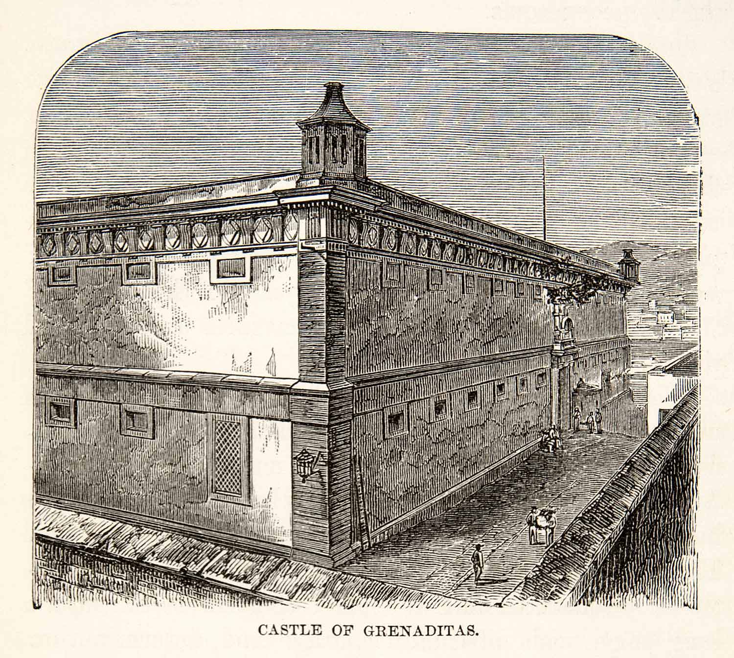 This is an original 1880 black and white in-text wood engraving of the Alhóndiga de Granaditas (public granary) which can be found in Guanajuato City, Mexico. It is an old grain storage warehouse. that was built in 1798.