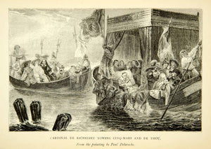 1880 Wood Engraving Cardinal Richelieu Cinq Mars Thou Delaroche France Boat XAZ1