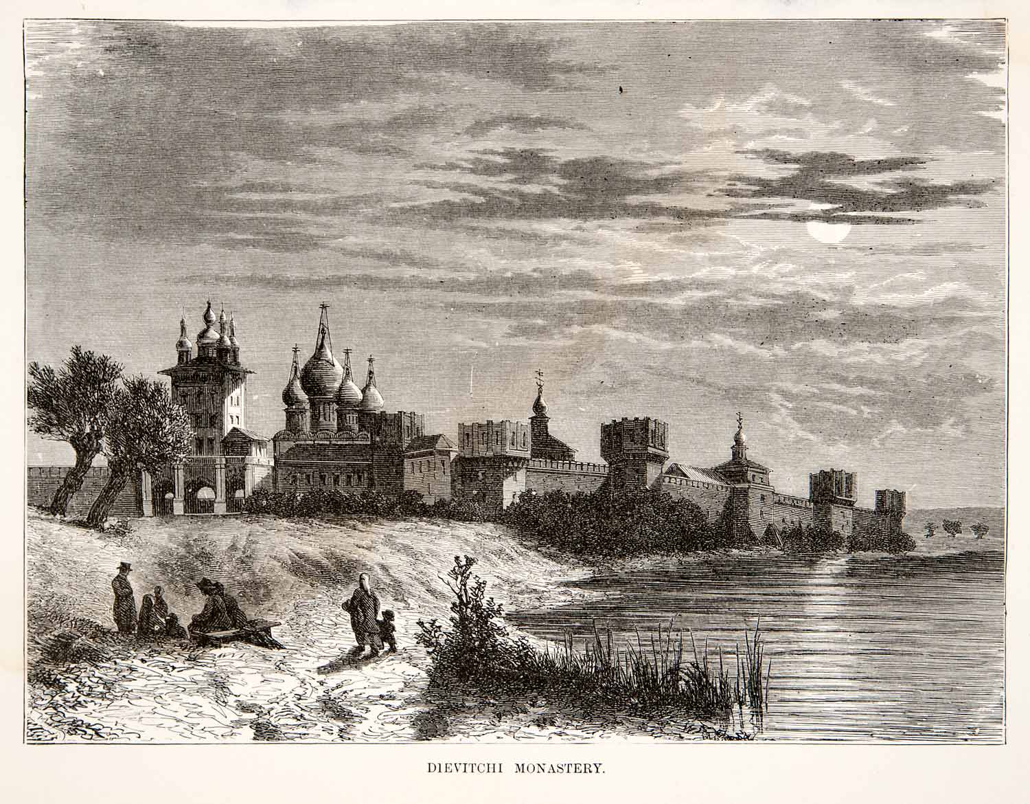 This is an original 1880 black and white wood engraving of "Dievitchi Monastery," or the Convent of the Virgin, located in Russia.