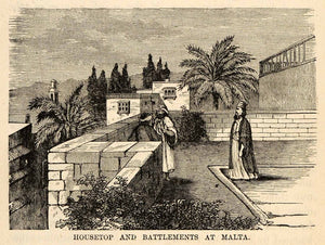 This is an original 1880 black and white wood engraving of a view of the city of Malta located on the island of Malta in the Mediterranean Sea.