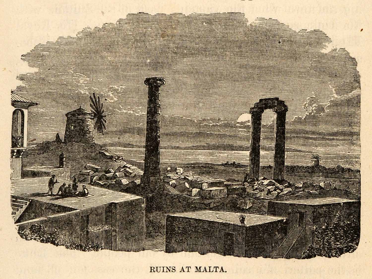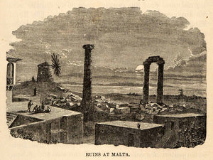 This is an original 1880 black and white wood engraving of some ruins located on the Island of Malta in the Mediterranean Sea.