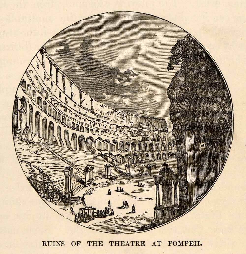 This is an original 1880 black and white wood engraving of the ancient ruins of a Theater located at Pompeii, Italy. The city was destroyed and buried under 13-20 feet of ash and pumice during the eruption of Mt. Vesuvius in 79 AD.