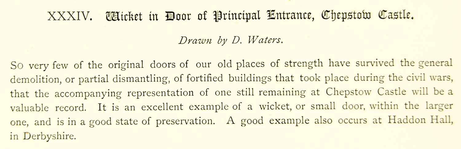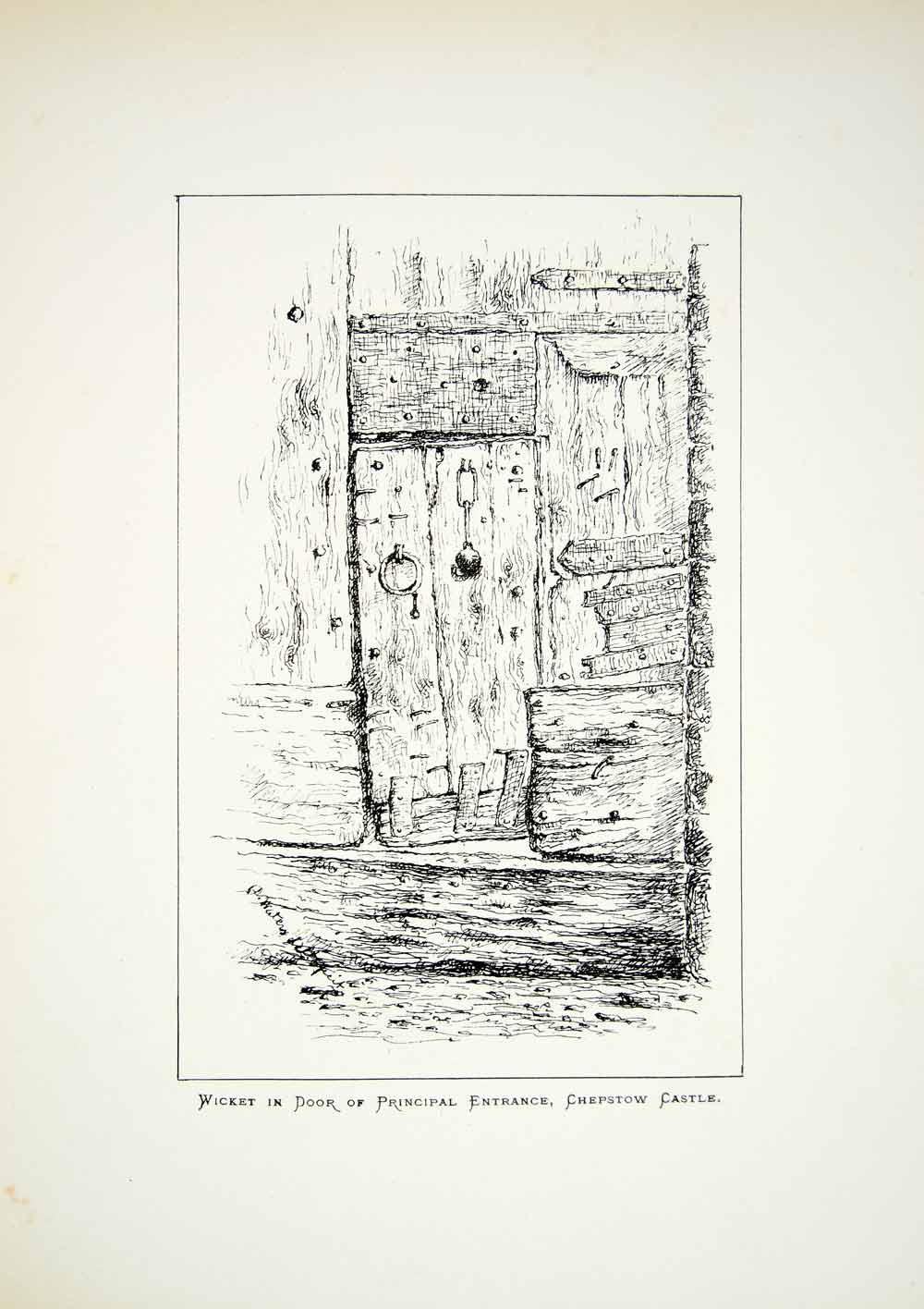 This is an original 1881 black and white lithograph of a drawing by D. Waters of a wicket in one of the entrance doors to Chepstow Castle in Monmouthshire, Wales, United Kingdom. The castle is a Grade I listed building by English Heritage.
