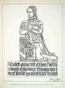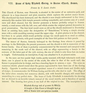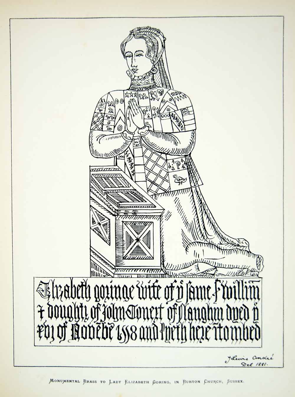 This is an original 1881 black and white lithograph of a drawing by J. Lewis Andrè of the monumental brass to Lady Elizabeth Goring that is located inside parish church in the village of West Burton in West Sussex, England, United Kingdom.