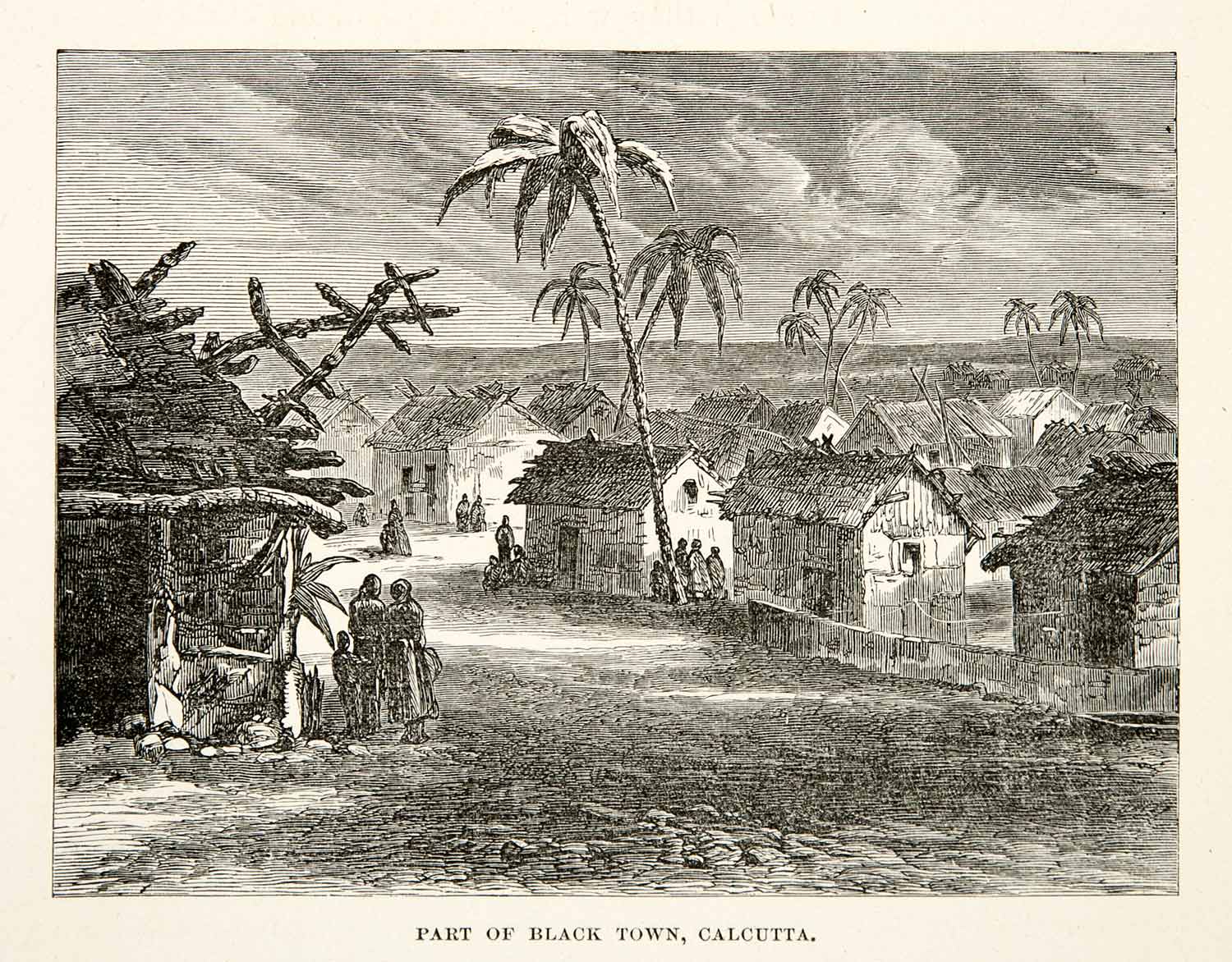 This is an original 1881 black and white relief line-block print of the part of Calcutta (Kolkata) named Black Town where the Indian people would live while the British lived in the White Town.