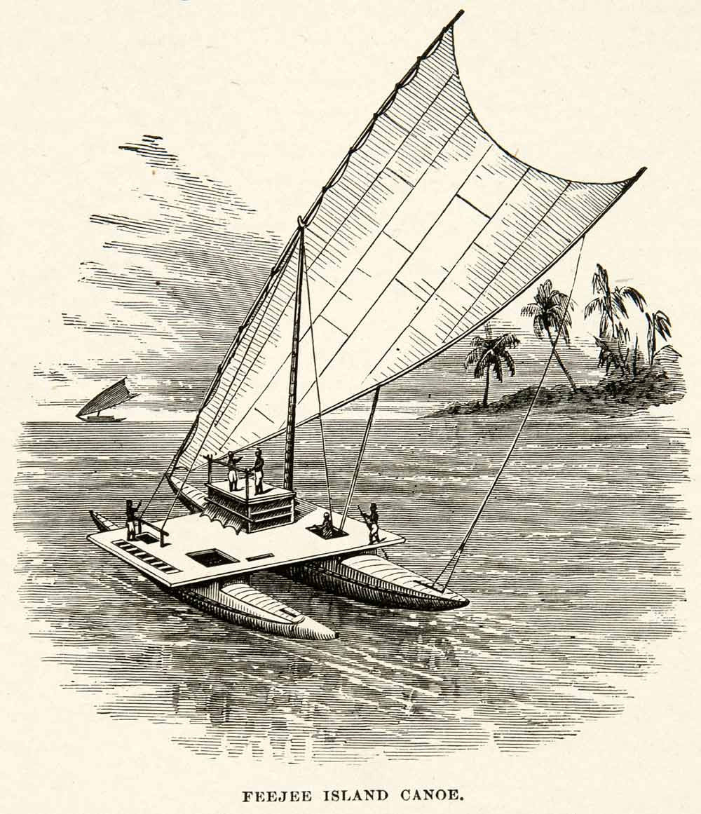 This is an original 1881 black and white relief line-block print of a Fiji Island canoe in the South Pacific Ocean .