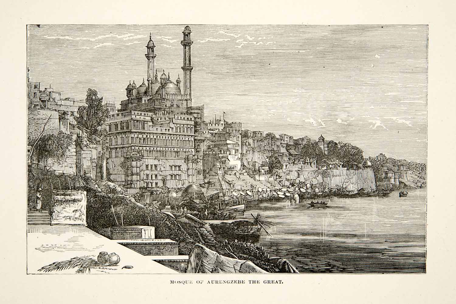 This is an original 1881 black and white relief line-block print of the mosque of Aurengzeb the Great, who was a Mughal Emperor in Varanasi, India.