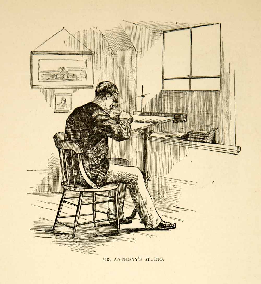 This is an original 1881 black and white wood engraving depicting a portrait of Andrew Varick Stout Anthony working in his studio. Anthony was an American wood engraver.