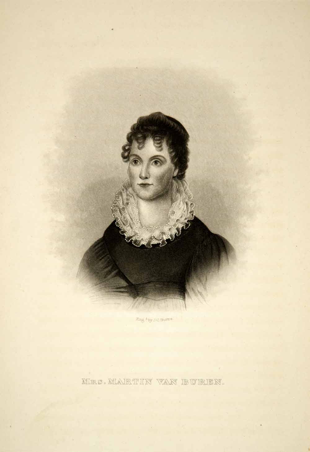This is an original 1881 black and white steel engraving by John Chester Buttre (1821-1893) that portrays Hannah Hoes Van Buren (1783-1819), the wife of Martin Van Buren (1782-1862), the eighth President of the United States of America. Hannah died of tuberculosis before her husband Martin became President. He never remarried however, and was one of the few Presidents to be unmarried while in office.