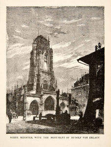 This is an original 1881 black and white wood engraving of the Berne Minister and the monument of Rudolph von Erlach in Switzerland.
