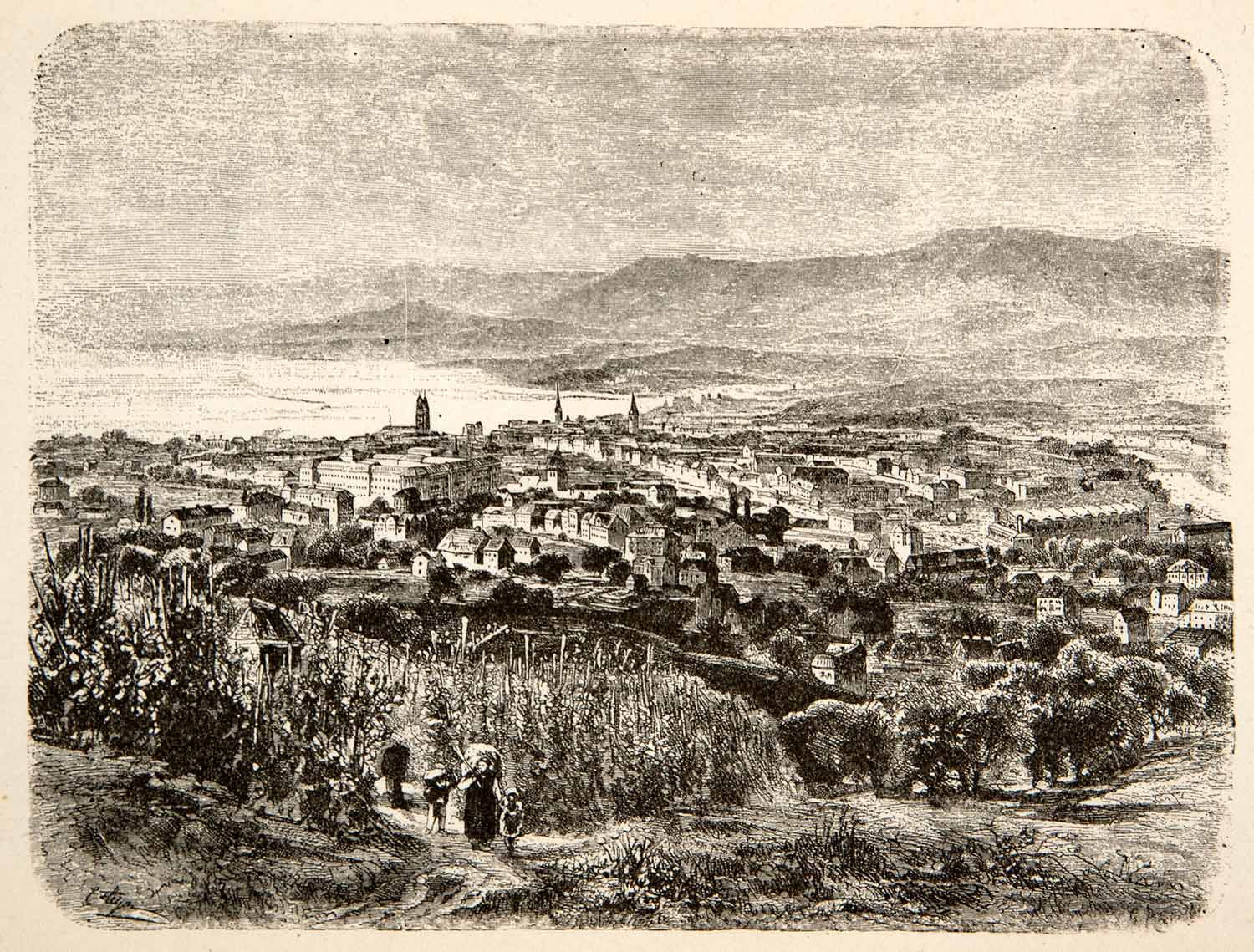 This is an original 1881 black and white wood engraving of the view of Zurich, Switzerland.