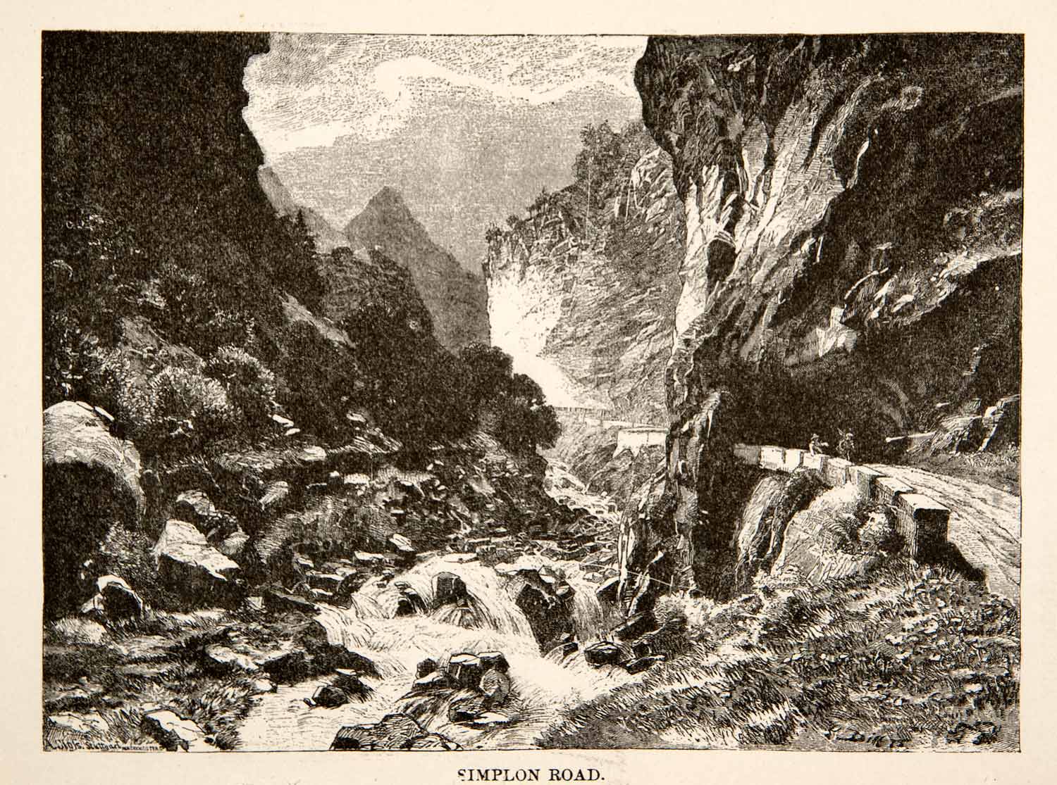 This is an original 1881 black and white wood engraving of the road on Simplon Pass between the Pennine and Lepontine Alps in Switzerland.