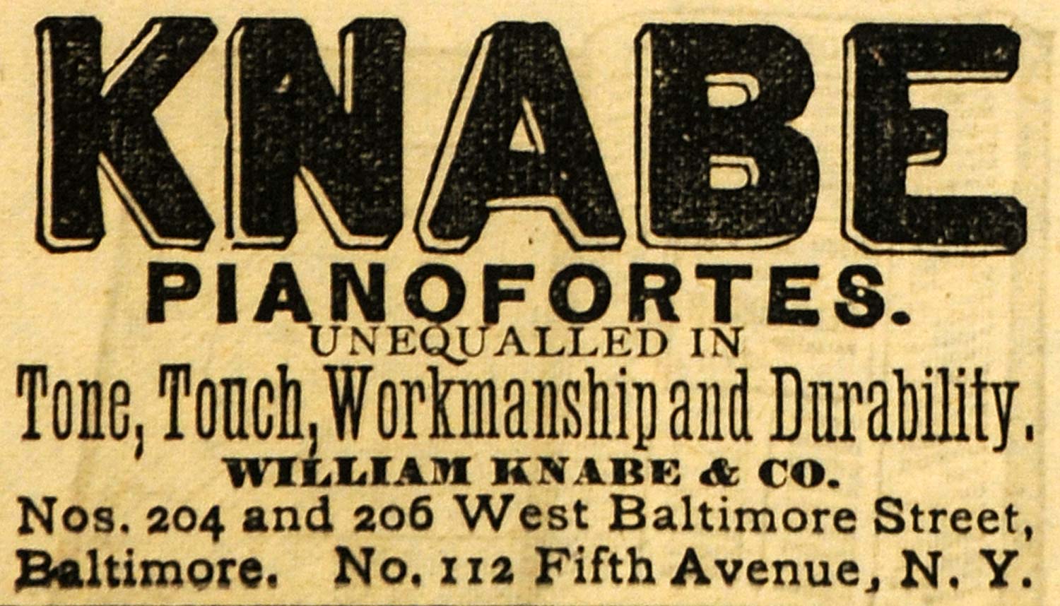 This is a tiny original 1882 black and white print ad for Knabe Pianofortes by William Knabe & Company.