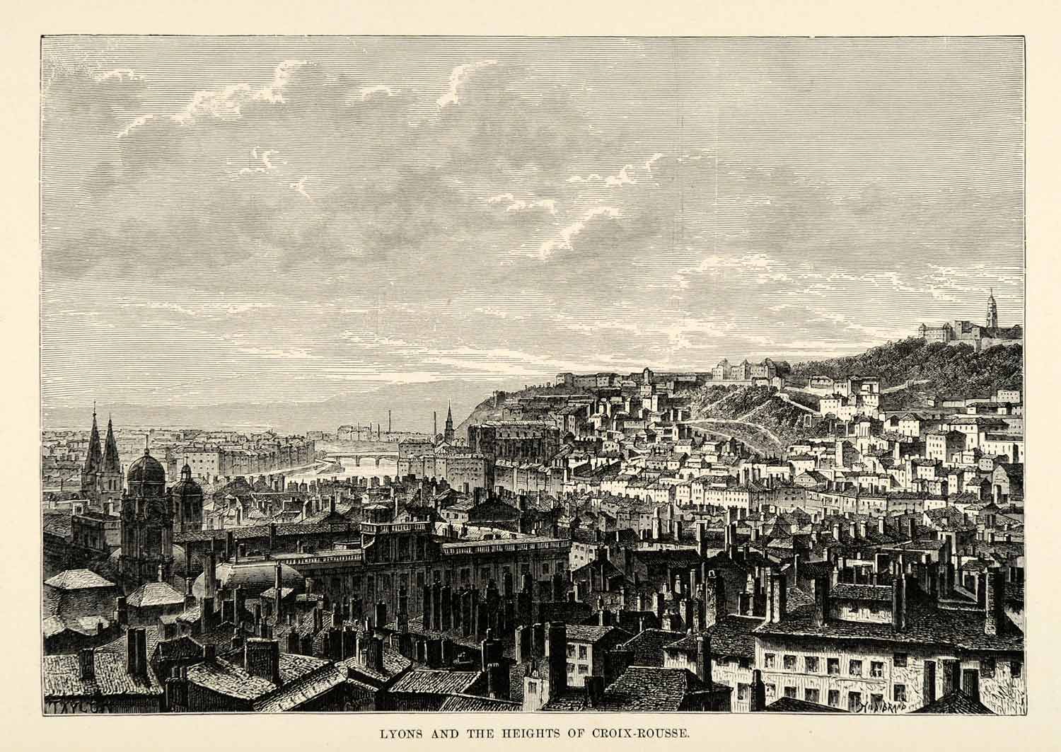 This is an original 1882 black and white wood engraving of "Lyons and the Heights of Croix-Rousse."
