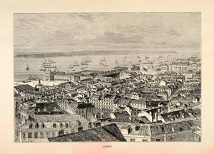 This is an original 1882 black and white wood engraving of the city of Lisbon in Portugal.