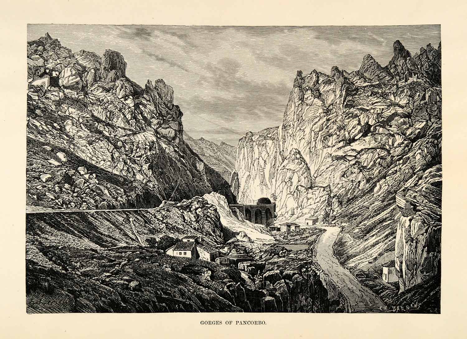 This is an original 1882 black and white wood engraving of the gorges of Pancorbo in Spain.