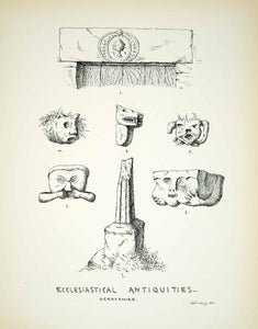 This is an original 1882 black and white lithograph of an illustration by Thomas Brushfield of ecclesiastical antiquities from Derbyshire, England.