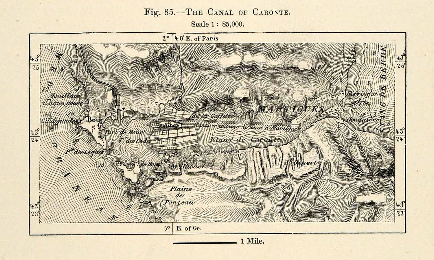 This is an original 1882 black and white relief line-block map of the Canal of Caronte in France.