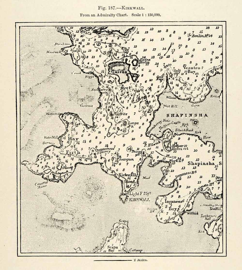 This is an original 1882 monochrome relief line-block map showing mainland Orkney's capital city of Kirkwall, Scotland. In popular culture, The Simpsons character, "Groundskeeper Willie", is said to be from Kirkwall.