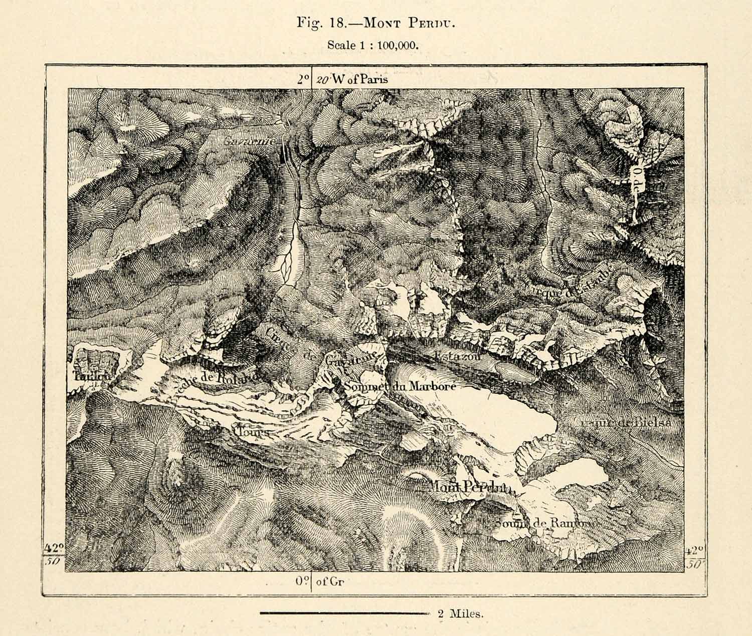 This is an original 1882 monochrome relief line-block map of "Mont Perdu."