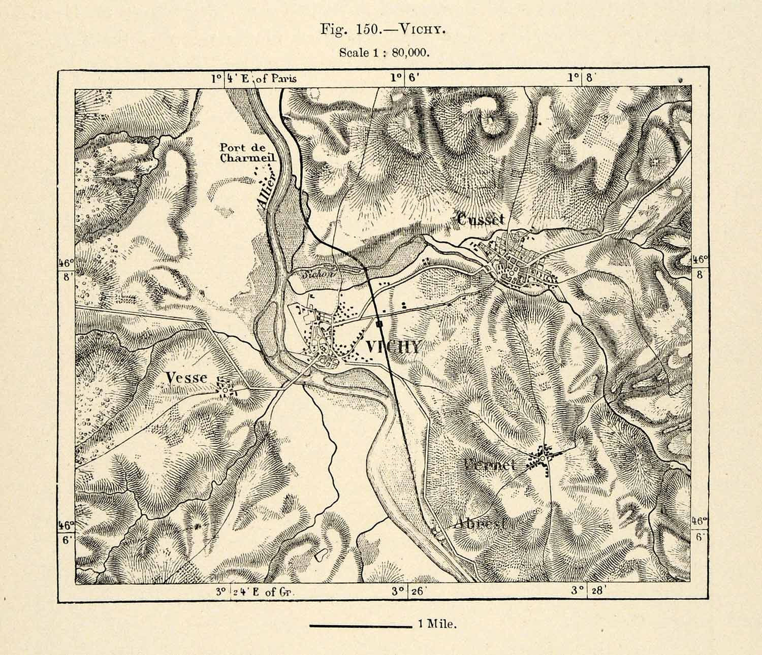 This is an original 1882 monochrome relief line-block map of Vichy, France (Republique Française) and surrounding areas.