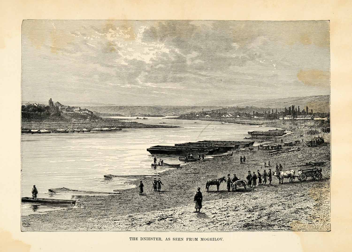This is an original 1882 black and white wood engraving of the Dniester River, as visible from the city of Moghilov in Belarus.