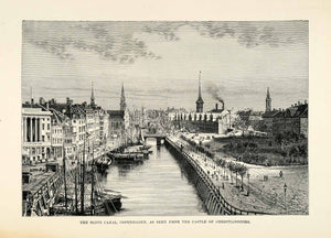 This is an original 1882 black and white wood engraving of a view of Frederiksholms Canal, as visible from the Castle of Christiansberg at Slotsholmen, Copenhagen, Denmark.