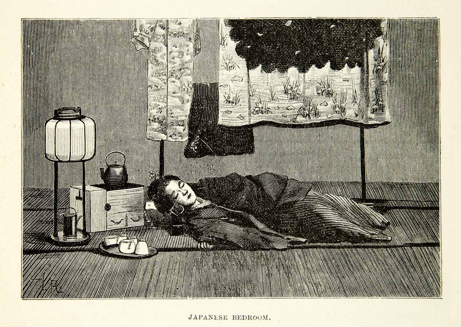 Keywords specific to this image: Japan, Asian, Oriental, Curtains, Chest, Cabinet, Furniture, Home, House, Lamp, Cups, Dishes, Tatami Mat, Dress, Fashion, Costume, Clothing, Female, Girl, Brazier