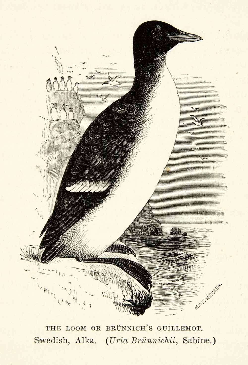 This is an original 1882 black and white in-text wood engraving of a portrait of a Thick-billed Murre or Brünnich's Guillemot (