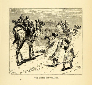 This is an original 1882 black and white wood engraving of a camel caravan of Morocco.