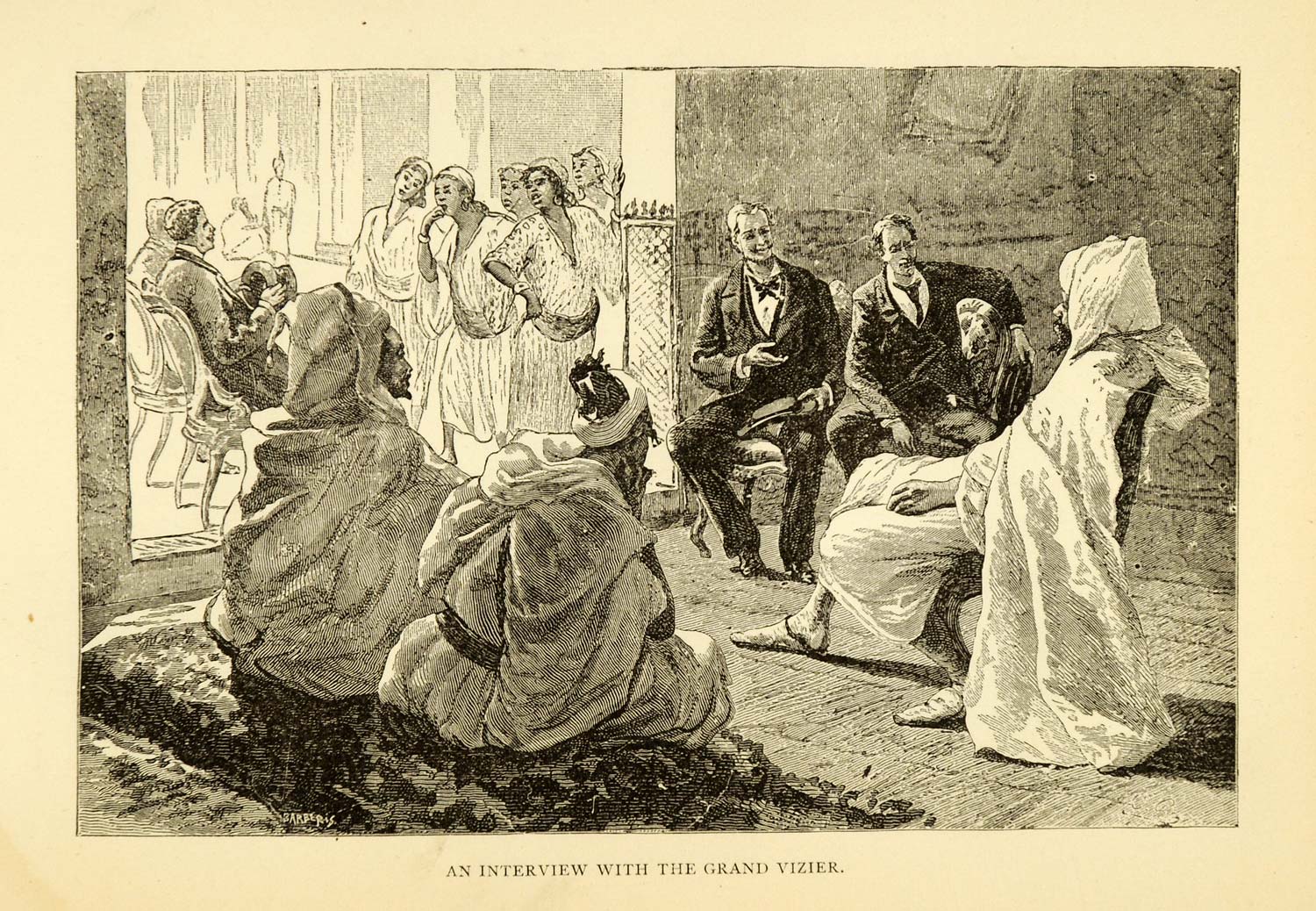 This is an original 1882 black and white wood engraving of a meeting with the Grand Vizier of Morocco.