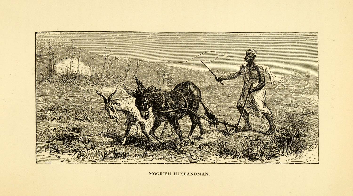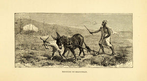 This is an original 1882 black and white wood engraving of a Moorish ground cultivator in Morocco.